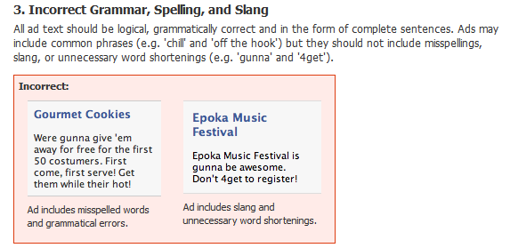 “Wait a minute, why am I even seeing this ad running, did the reviewer ‘forget’ about section 15 of the Facebook ad guidelines?” http://www.facebook.com/ad_guidelines.php